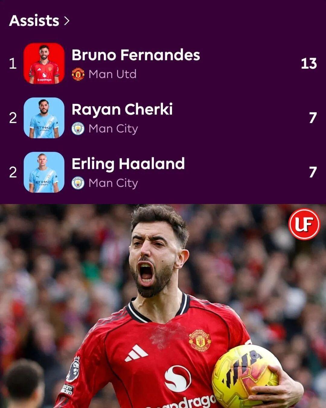 断档存在!B费本赛季在联赛中已贡献13个助攻,并列第2的谢尔基和哈兰德是7个。